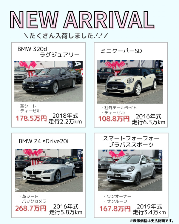 輸入車6台入荷しました🚗✨️ 2026.04.28 輸入車 こんにちは🙂↕️🫧 本日の投稿を担当致します、輸入車センターの富永です 新しく入荷したお車6台を紹介します🚗✨️ 気になるお車があれば お気軽にお問い合わせください😊.ᐟ.ᐟ ご来店お待ちしております🙂↕️🫧 ※金額は支払総額表示です 前の記事を見る 一覧へ戻る 次の記事を見る この記事をシェアする: